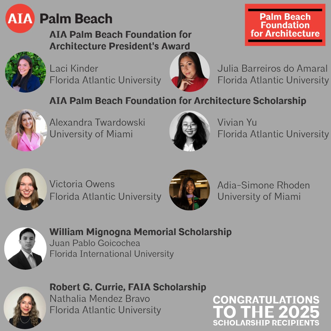 The AIA Palm Beach Foundation for Architecture and the Palm Beach Chapter of the AIA have created a scholarship fund available to Architecture students with a financial need whose primary residence is in Palm Beach County. Recipients will be invited to attend the AIA Palm Beach Design and Honor Awards Banquet on September 9, 2026, at the Breakers to formally receive the award.